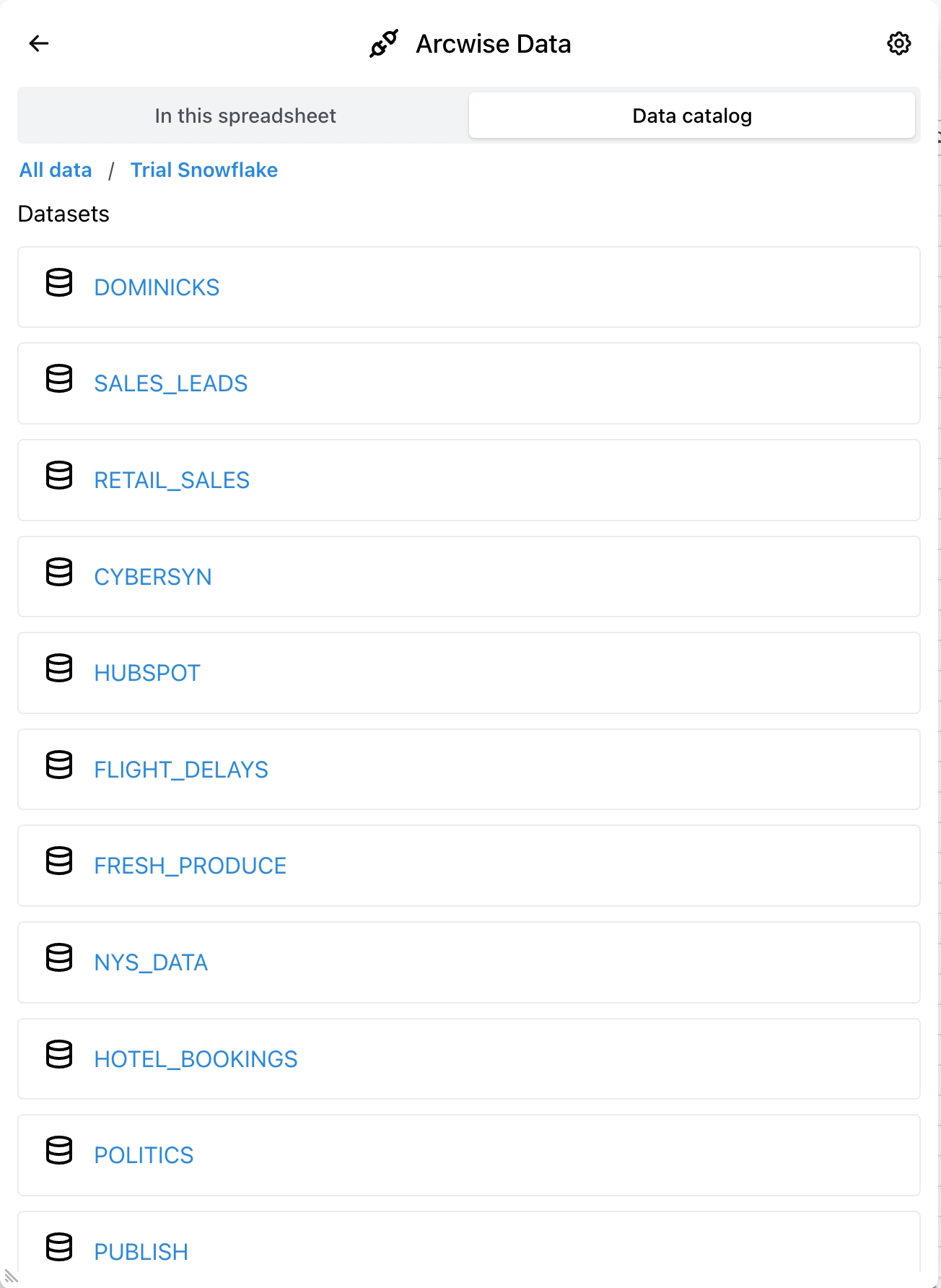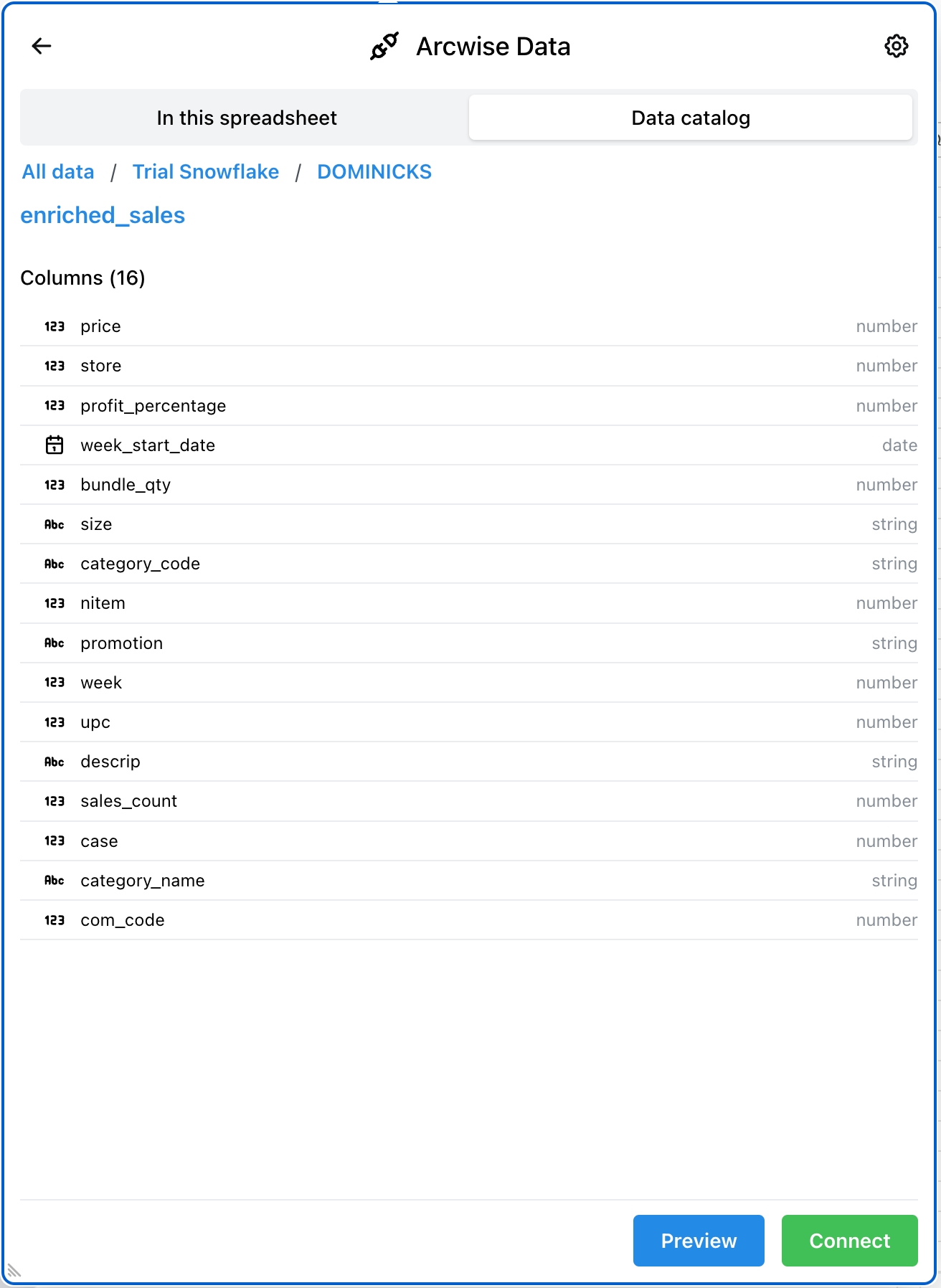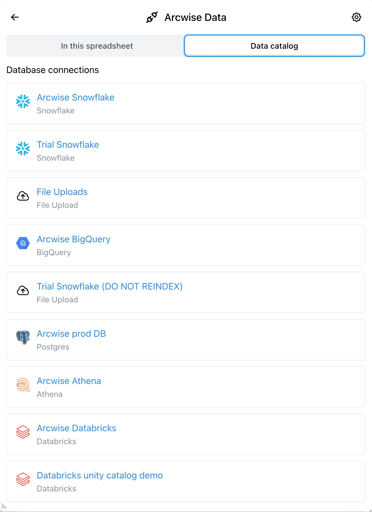 Catálogo de datos: Utilice esta opción si desea conectar rápidamente una tabla conocida.