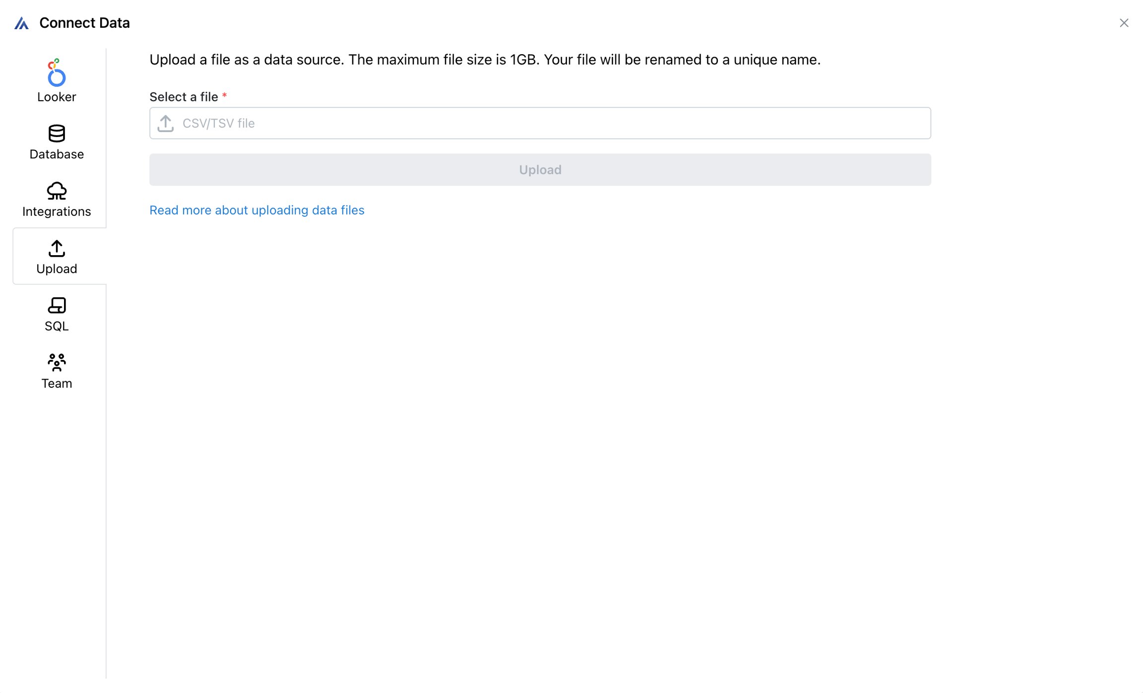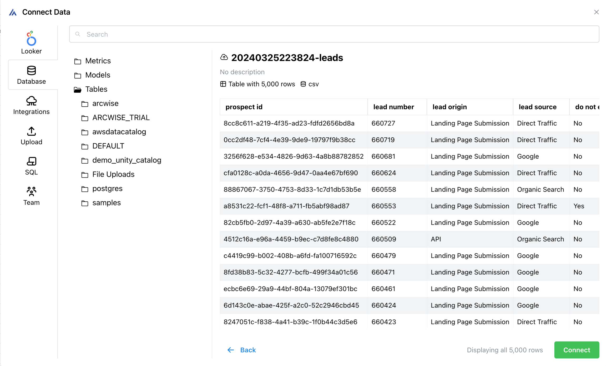 Arcwise permite a los usuarios cargar archivos CSV y TSV. Luego, estos archivos se pueden unir con otros datos de su almacén de datos o otras herramientas conectadas (Salesforce, Netsuite, etc.).
