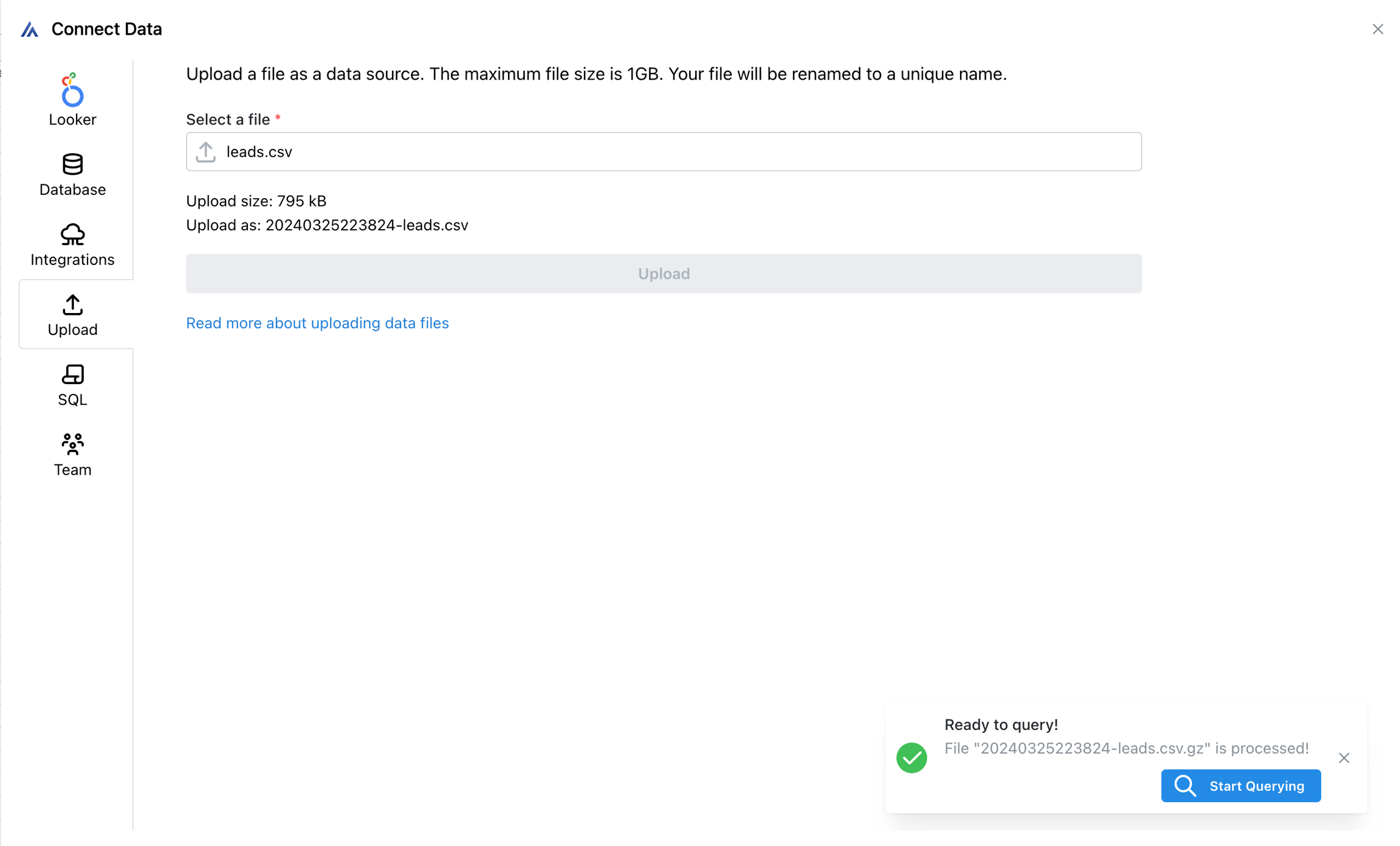 4) Después de cargar el archivo, aparecerá una pequeña ventana emergente en la esquina inferior derecha. Haga clic en el botón azul Iniciar consulta.