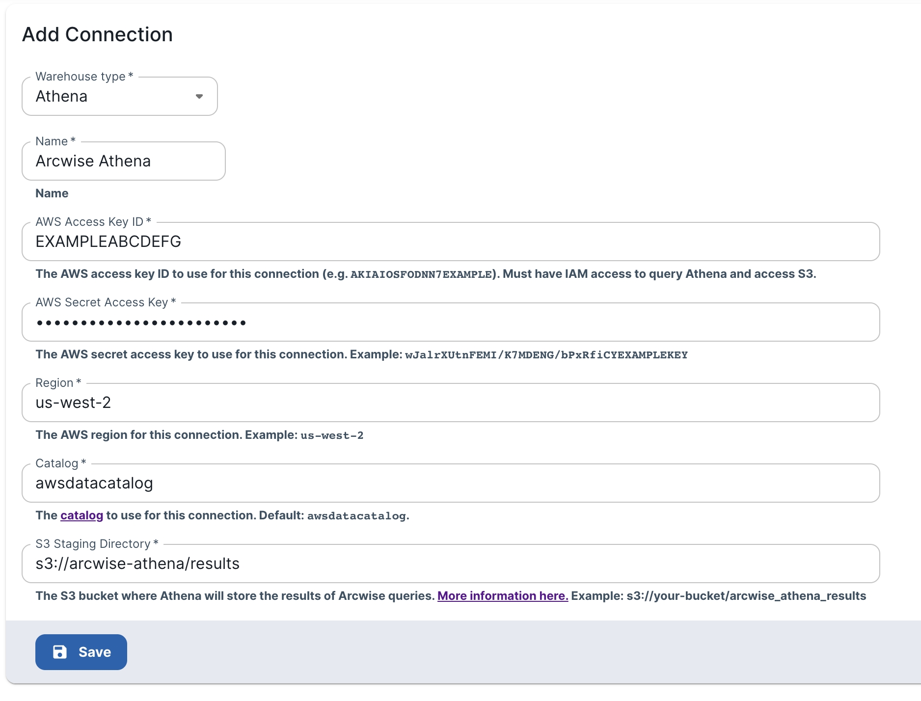 Athena requires a S3 bucket path to store the results of queries. The access key / secret must have write access to this bucket. NOTE: you may want to set up the bucket lifecycle to automatically purge old query results automatically. Arcwise doesn't require past query results to be accessible.