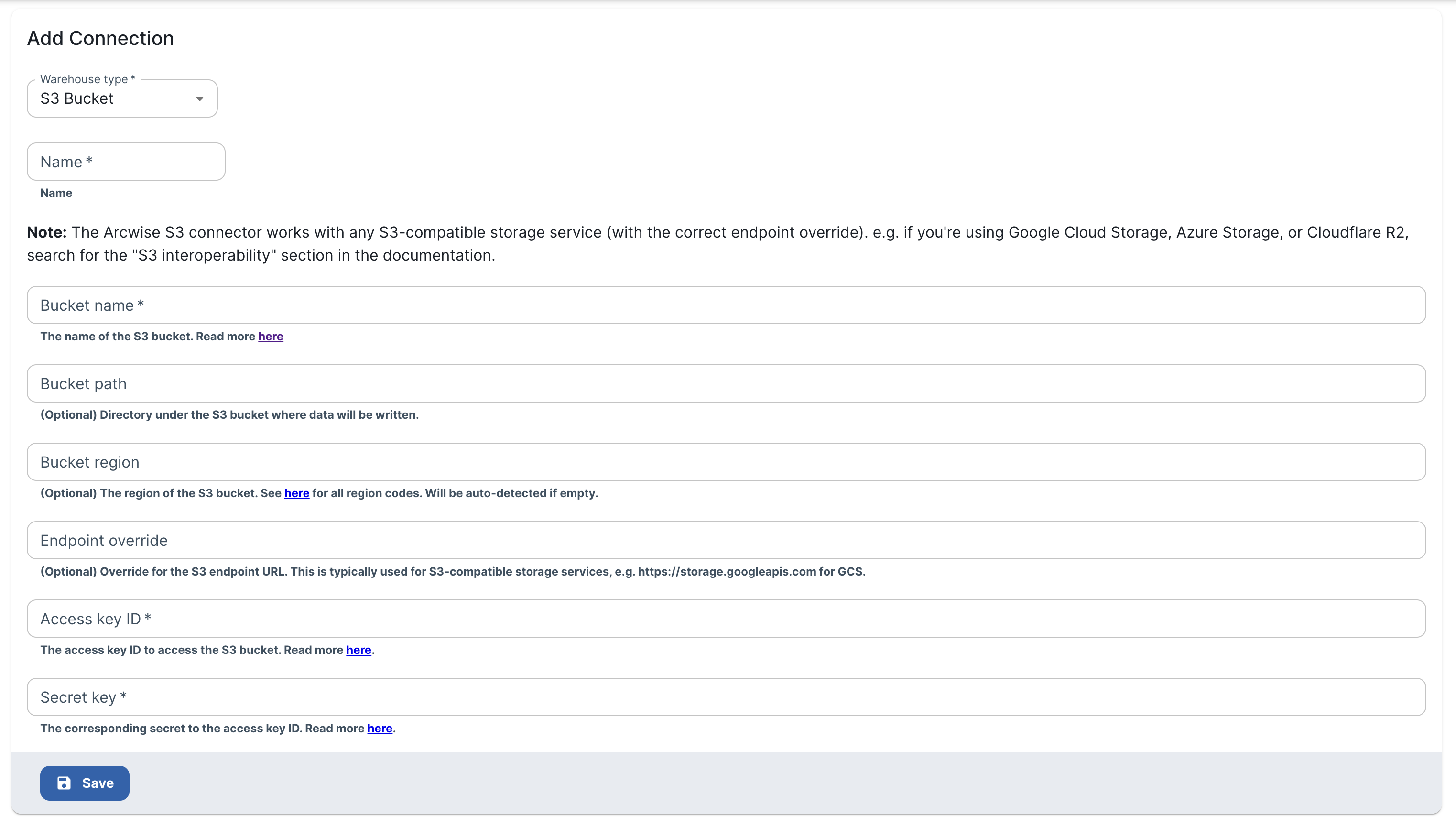 Arcwise supports any S3-compatible storage bucket as as a destination for third-party integrations. See [Connecting to Integrations](https://docs.arcwise.app/espanol/configuracion-de-arcwise/integraciones/descripcion-general) for more details. (Arcwise will create a Parquet file every time you pull data from an integration like Salesforce or Hubspot.)