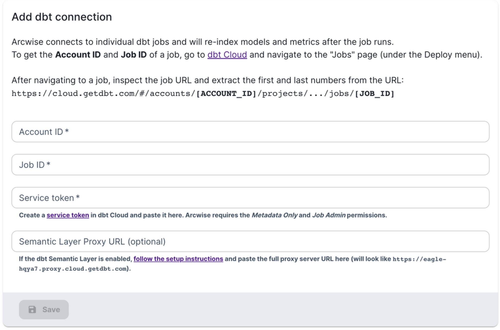 If you want to allow Arcwise to use [dbt metrics](https://docs.getdbt.com/docs/build/metrics), then you’ll need to link Arcwise to the dbt Semantic Layer. Follow the [semantic layer setup instructions from the dbt docs](https://docs.getdbt.com/docs/use-dbt-semantic-layer/setup-dbt-semantic-layer) (if you haven’t already) and paste the proxy URL from your job’s environment into Arcwise.