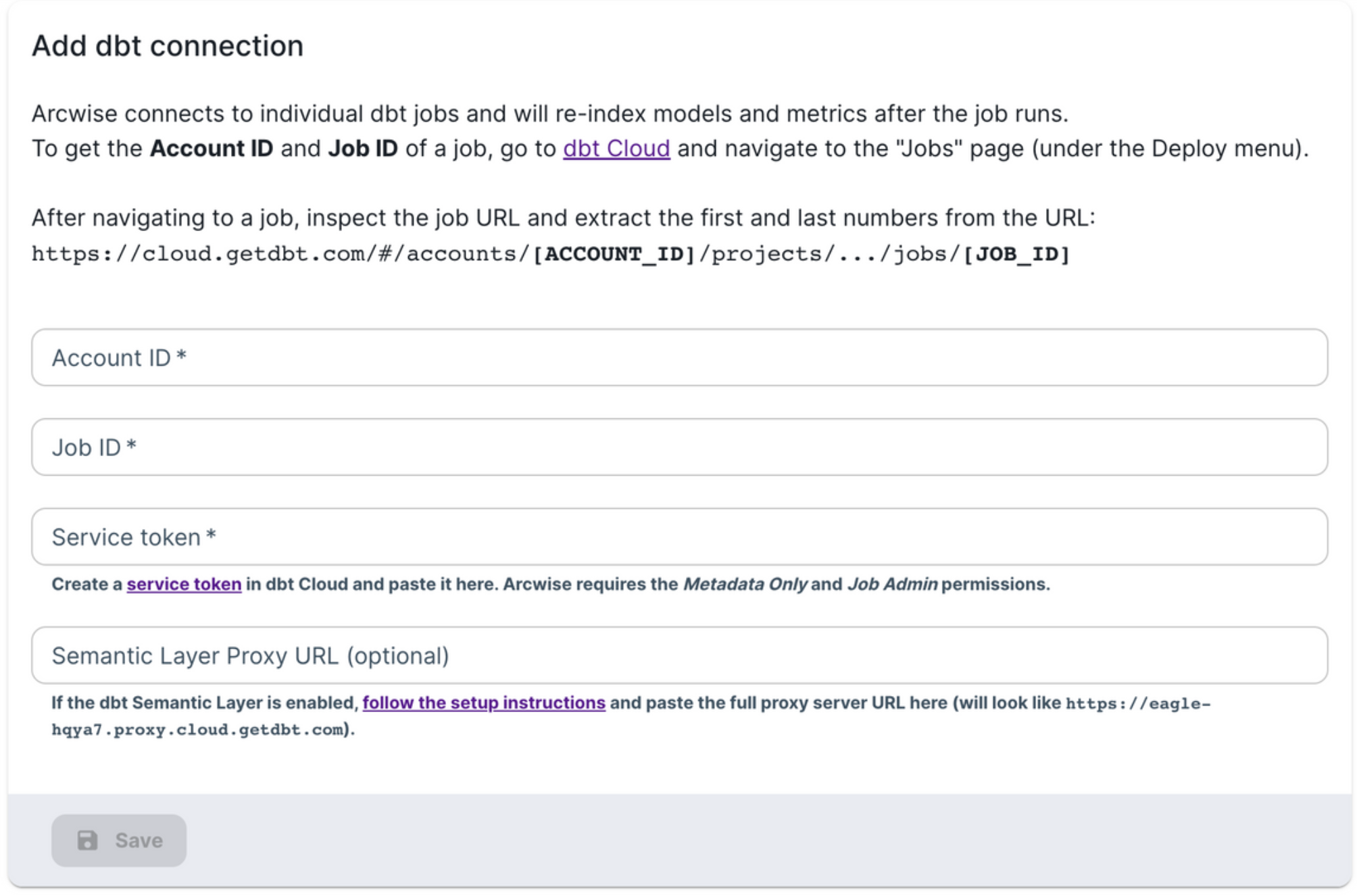 If you want to allow Arcwise to use dbt metrics, then you’ll need to link Arcwise to the dbt Semantic Layer. Follow the semantic layer setup instructions from the dbt docs (if you haven’t already) and paste the proxy URL from your job’s environment into Arcwise.
