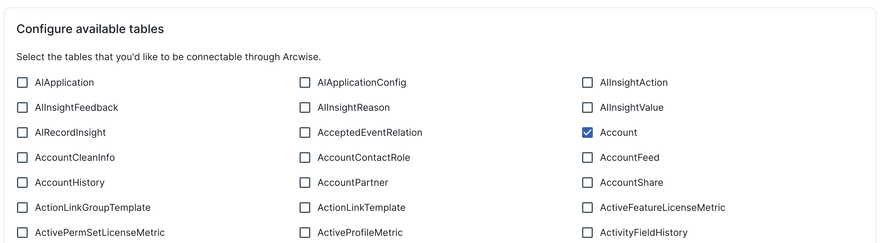 5. Once the list of available tables appears, use the checkboxes to select which Salesforce objects should be available to connect through the Arcwise addon. Scroll down and click "Save" when finished.<br>