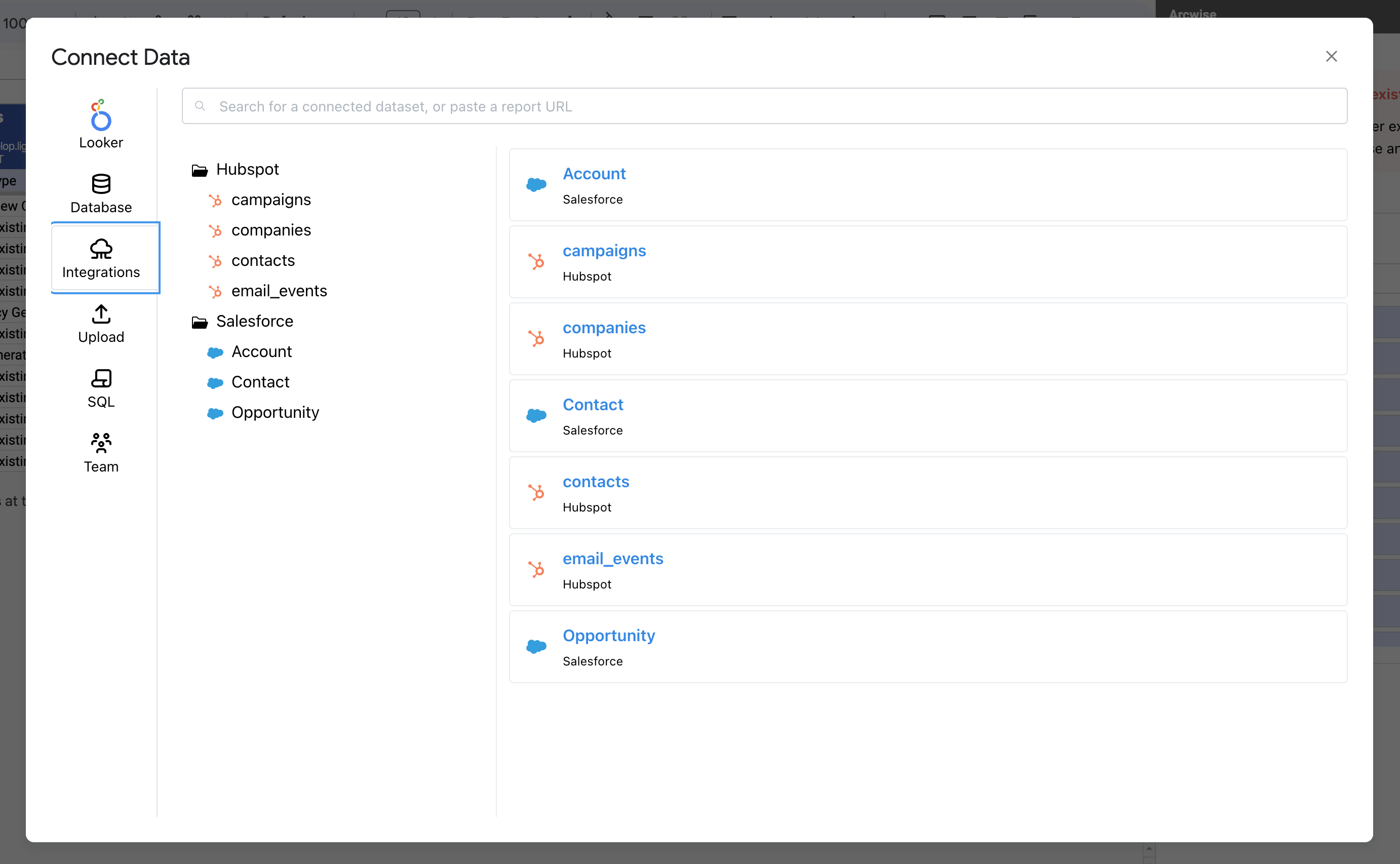 Once connected, you should be able to access the "Integrations" tab from the Connect Data dialog and see the list of tables enabled above: