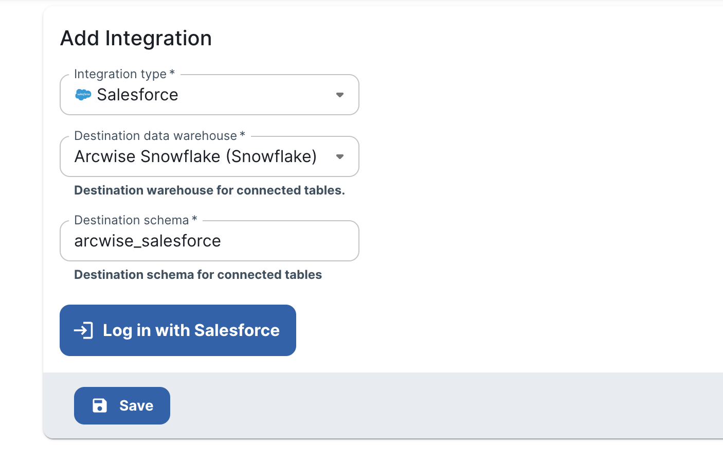 4. Click the "Log in with Salesforce" button and enter your Salesforce login details. It may take a few minutes to sync the available set of tables.