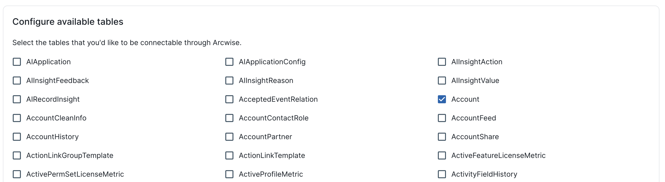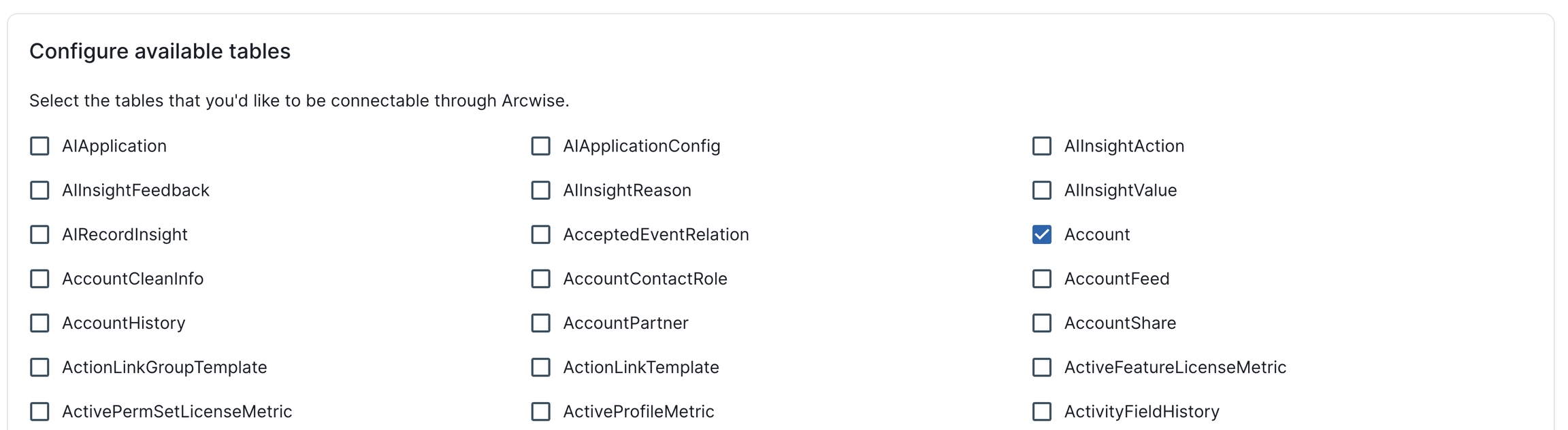 Once the list of available tables appears, use the checkboxes to select which Salesforce objects should be available to connect through the Arcwise addon. Scroll down and click "Save" when finished.