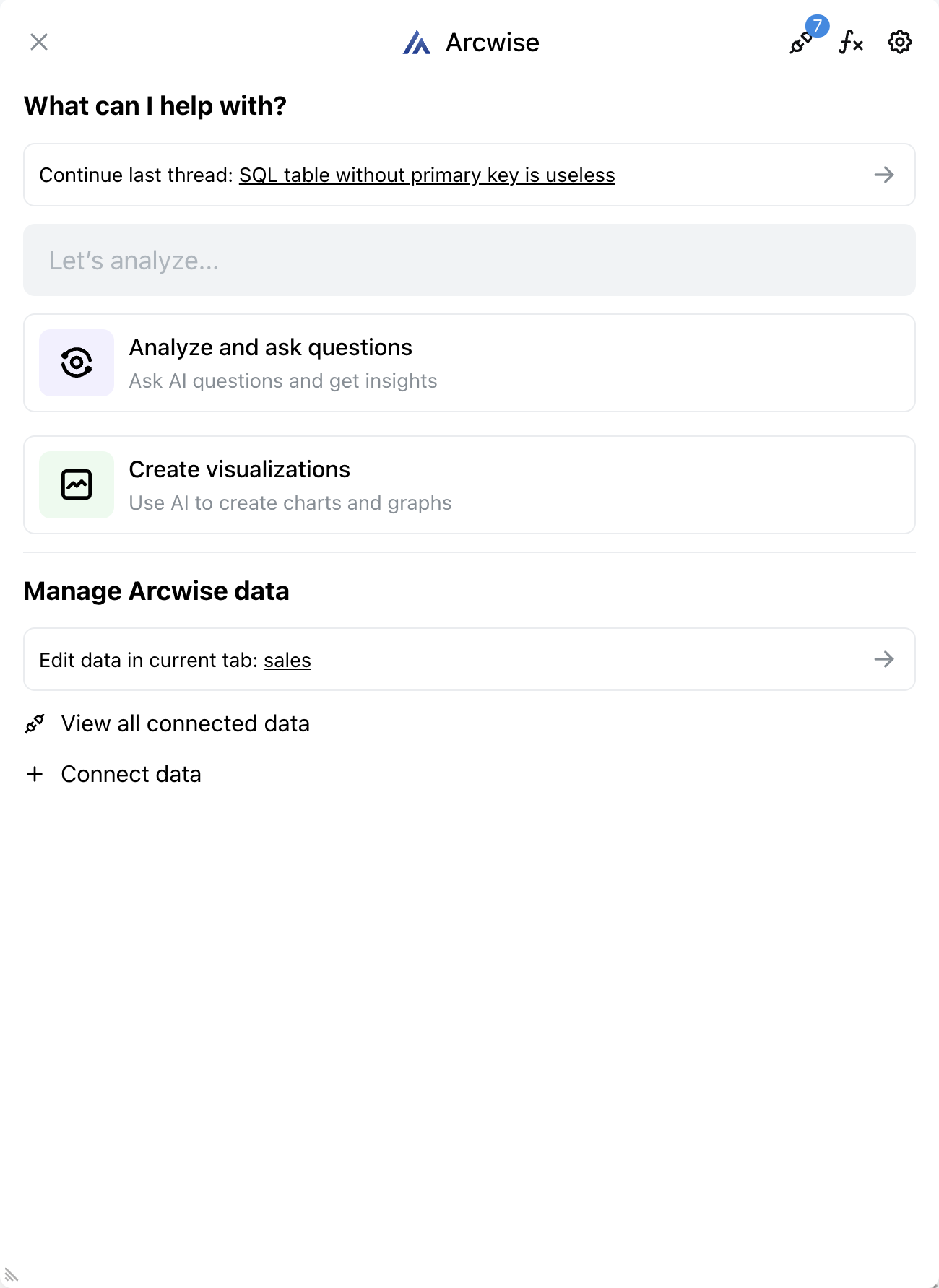 Para interactuar con una pestaña de datos conectada a Arcwise, debe utilizar la interfaz de Arcwise para esa pestaña.