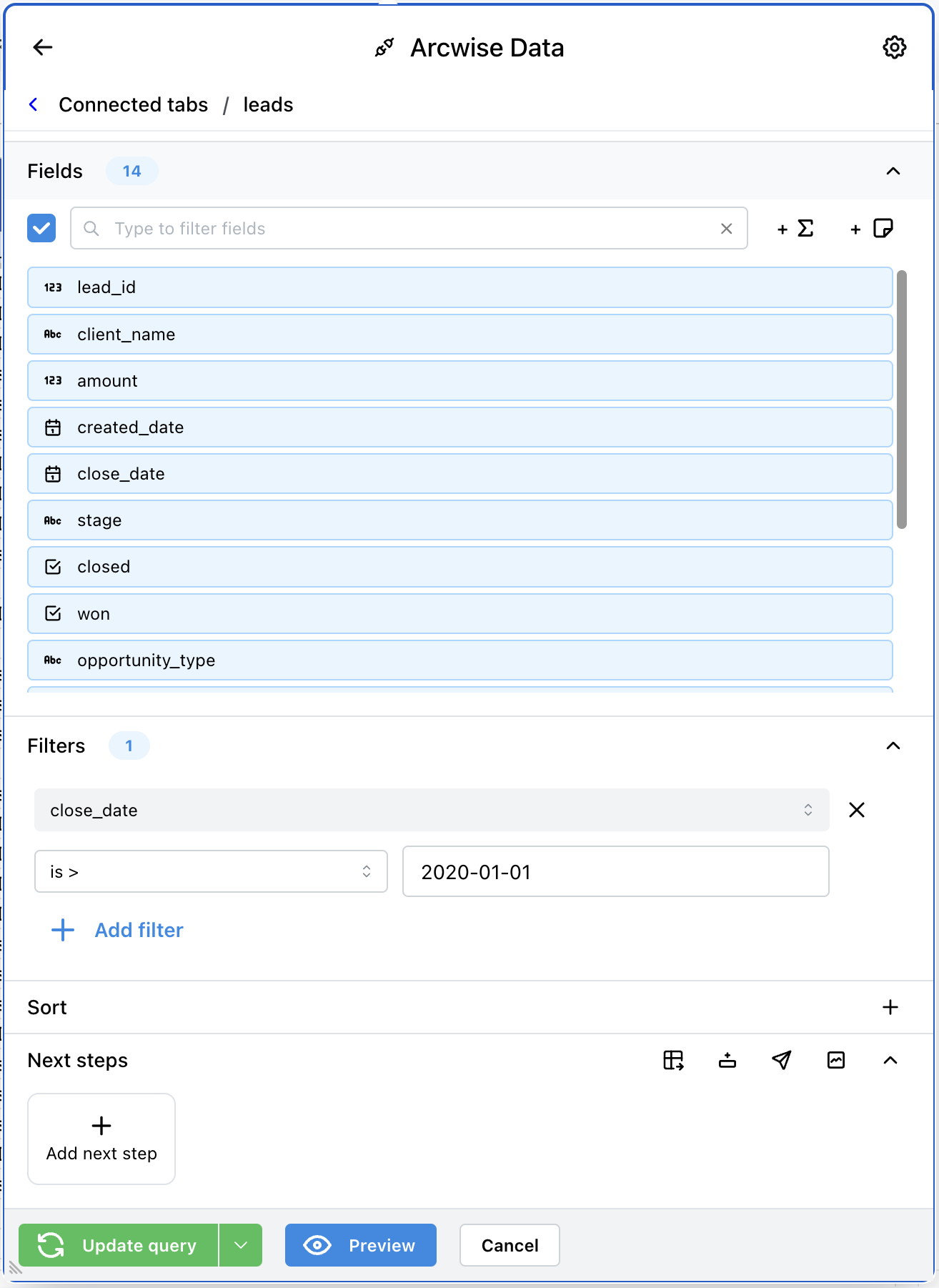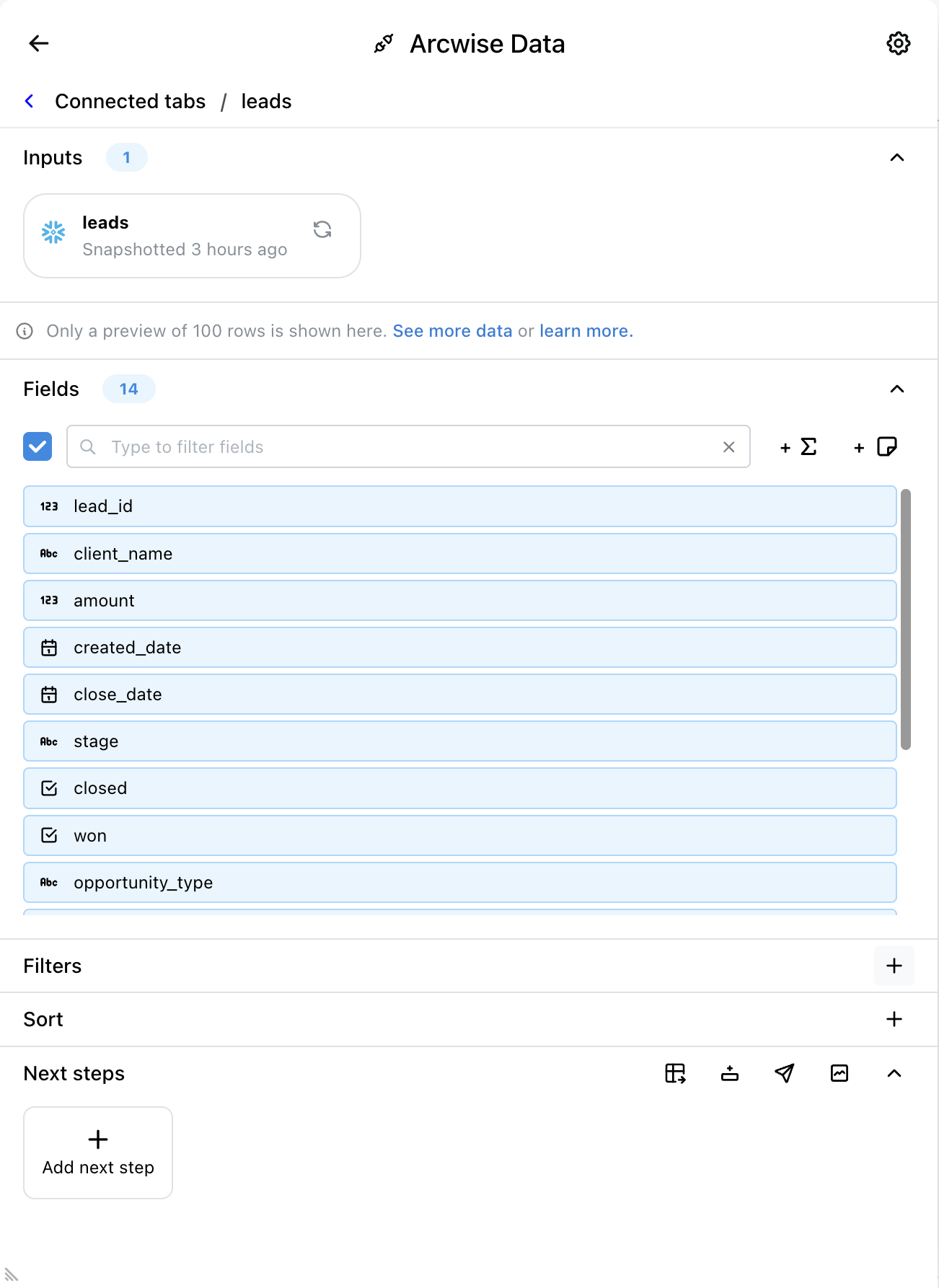 Puede agregar una cantidad arbitraria de filtros a cualquier pestaña de datos conectada a Arcwise. Para filtrar datos, navegue hasta la interfaz de datos conectados de Arcwise Datos Conectados de Arcwise.
