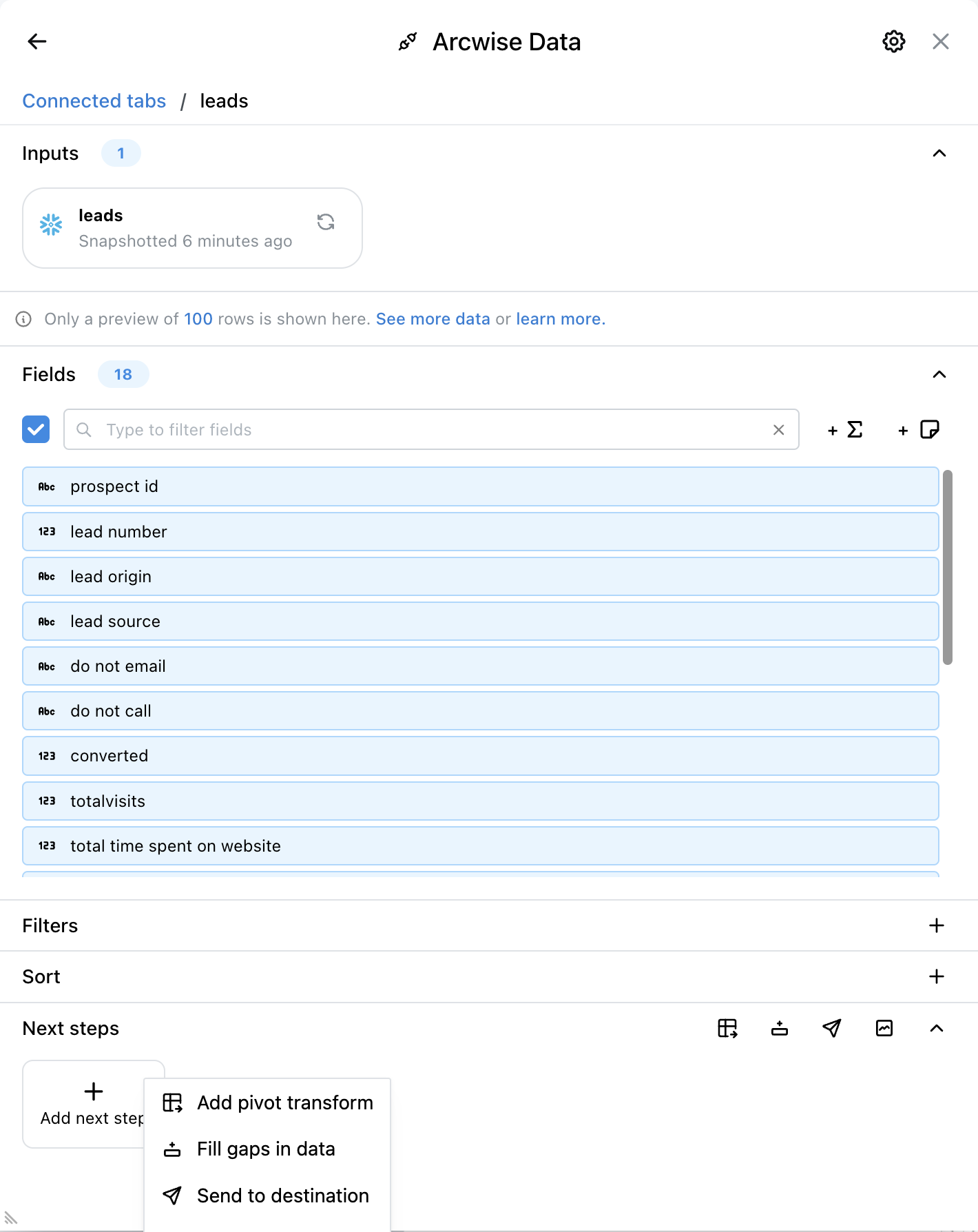 Arcwise admite pivotes en pestañas de datos. Para crear un pivote, siga los pasos a continuación.