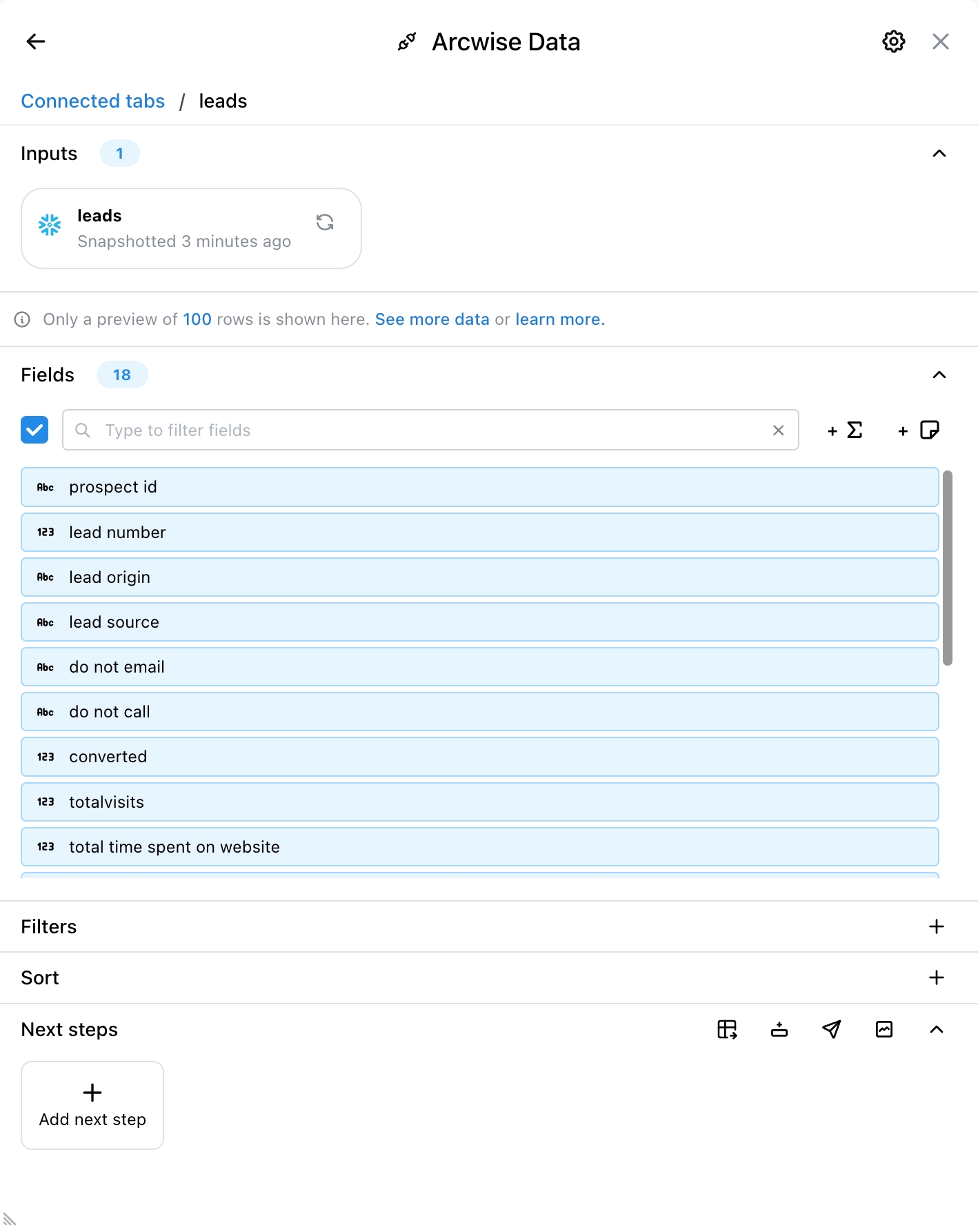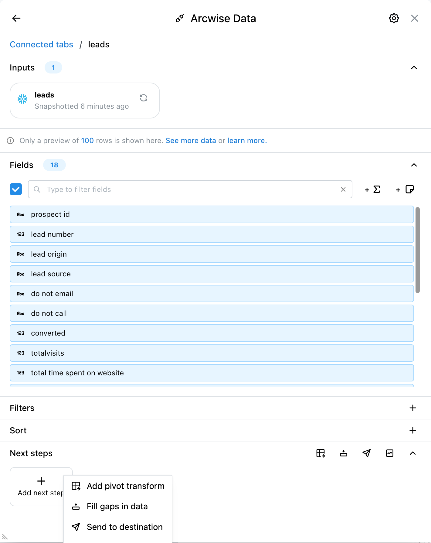 1) Navega hasta el Datos Conectados de Arcwise pestaña en la que le gustaría hacer un pivote.