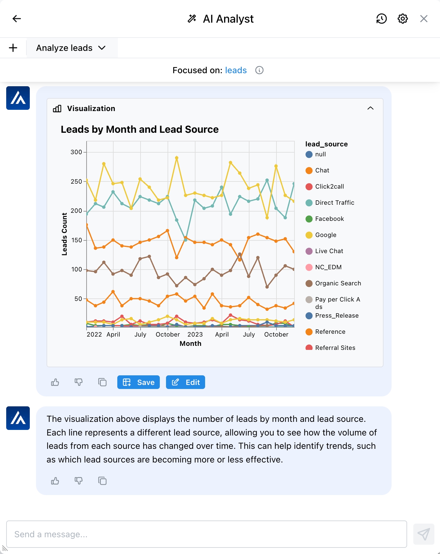 Este mensaje se puede ejecutar desde una hoja en blanco o desde una hoja con alguna pestaña llamada leads. Recuperará una tabla con el mes, la fuente de clientes potenciales y el recuento de clientes potenciales. Luego producirá una visualización de estos datos.