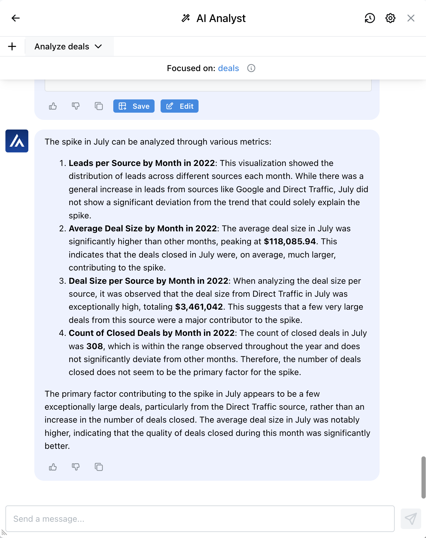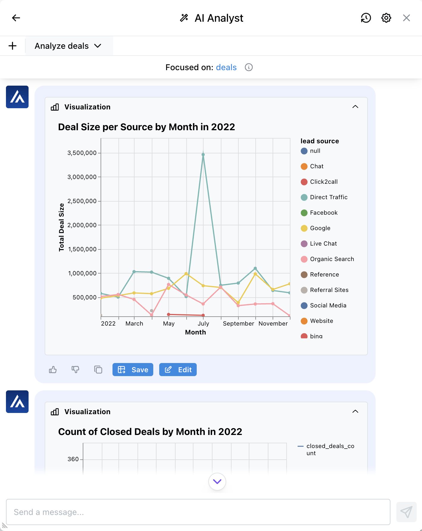 Comenzamos con un conjunto de datos de Salesforce que contiene todas nuestras ofertas. Queremos realizar un seguimiento del valor total de los acuerdos cerrados a lo largo del tiempo. Podemos obtener esta información del analista de IA.