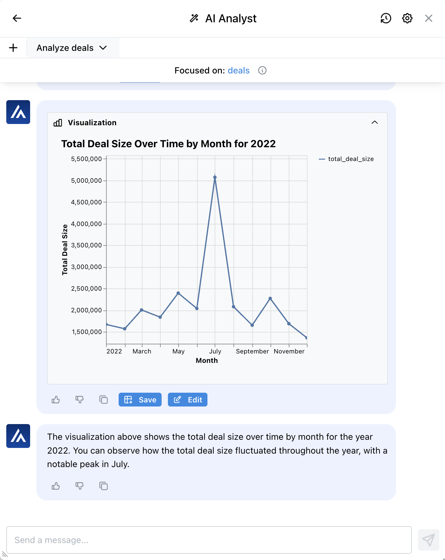 We start with a data set from Salesforce that contains all of our deals. We want to track the total value of closed deals over time. We can get this information from the AI analyst.