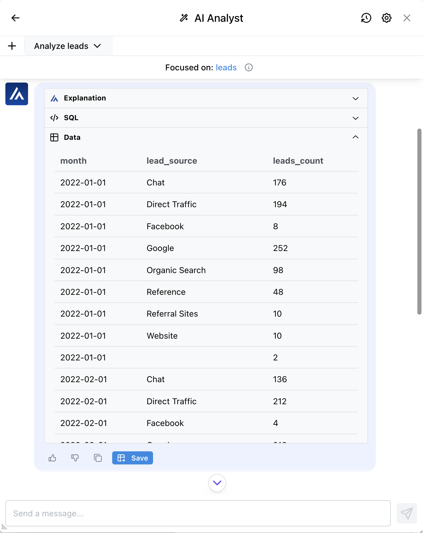 After asking the AI analyst for data you can save it to the sheet with the **Save** button.